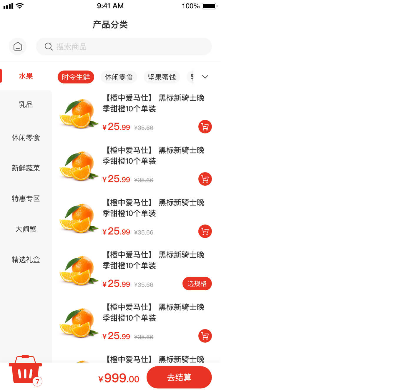 左侧展示一级分类,右侧顶部展示二级分类,列表展示商品