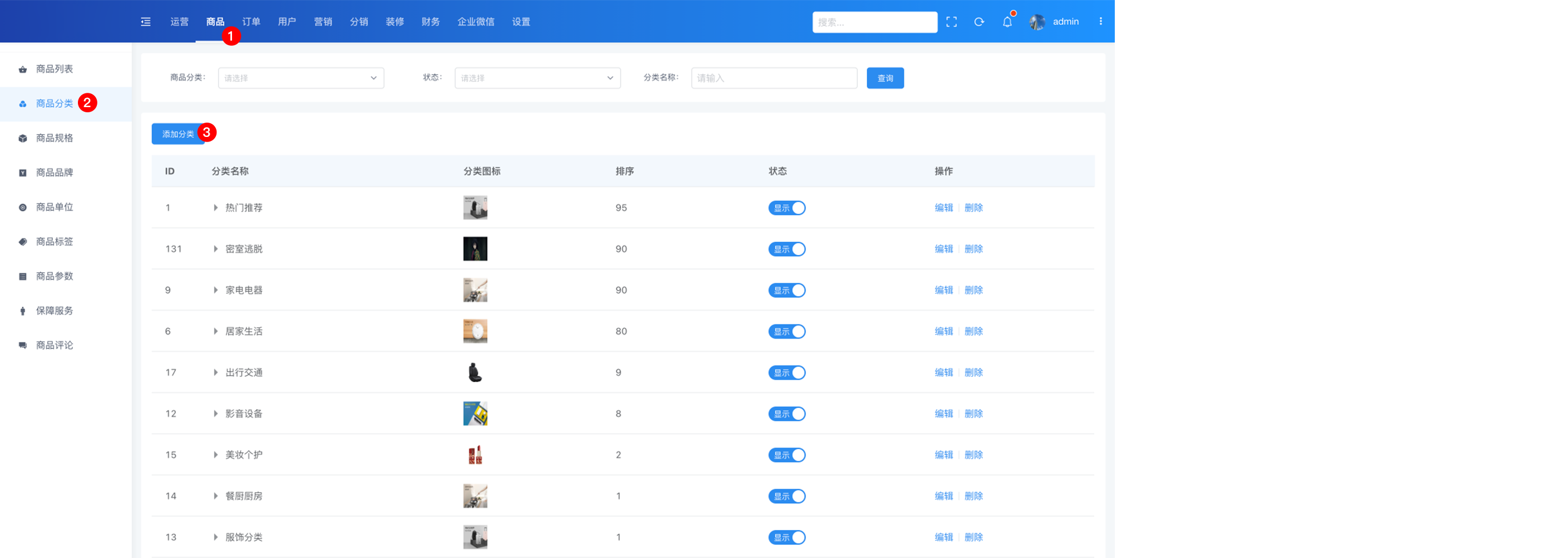 后台设置清晰明了的商品分类,有助于运营者更好的对商品分品类管理,也方便客户更快地找到自己想要的商品,实现快速下单