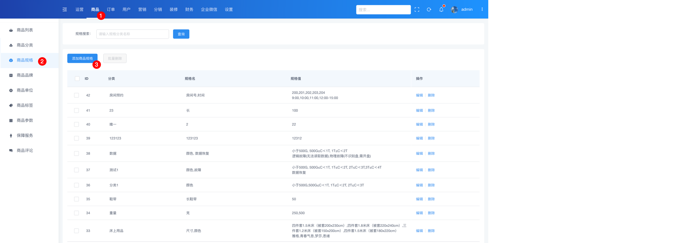 商品可提前设置规格,方便添加商品时快速创建多规格类的商品