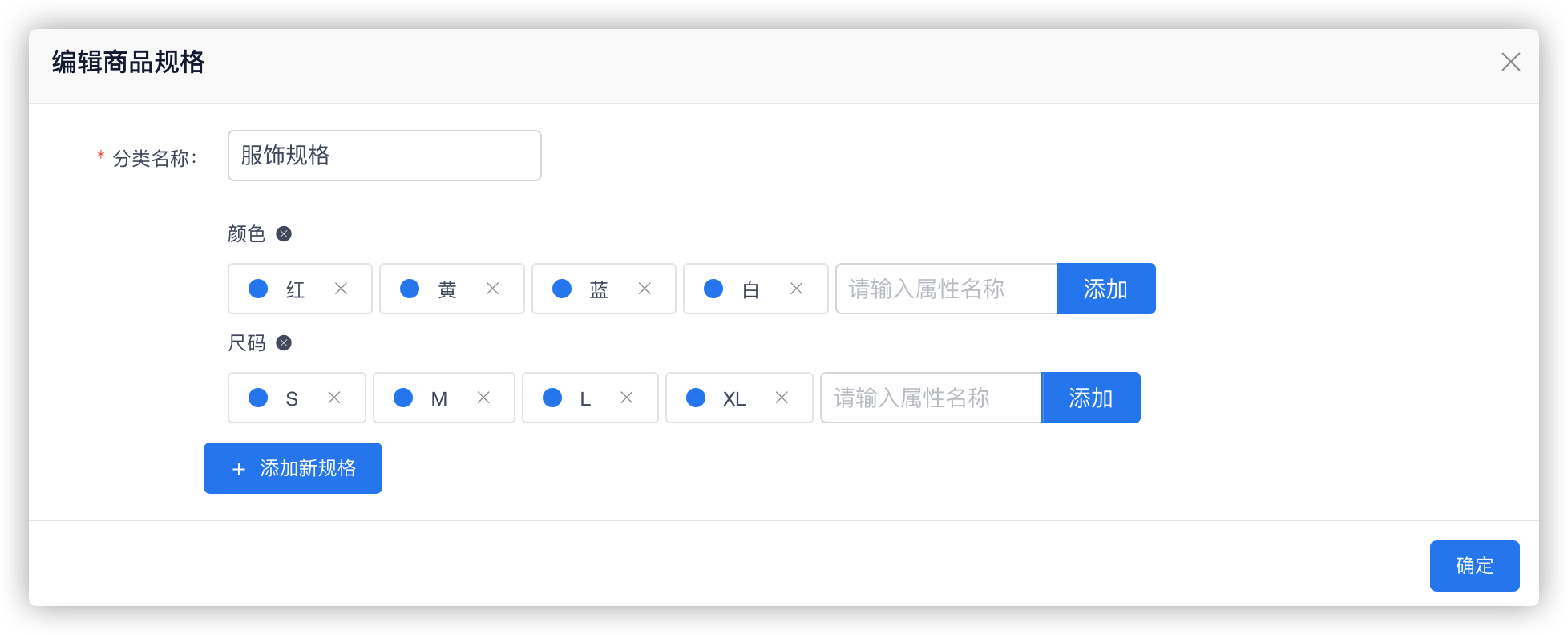 添加时分为规格名称、规格值,如图“颜色“为“规格名称“,“白色“为“规格值“
