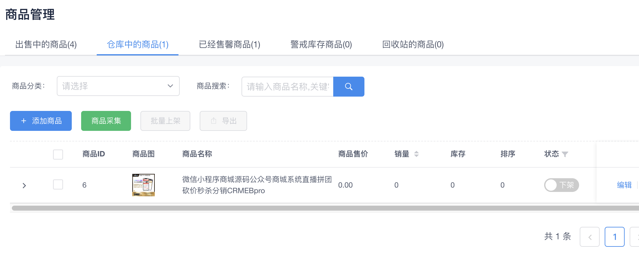 注意:采集的商品默认在【仓库中的商品】,且状态是下架。