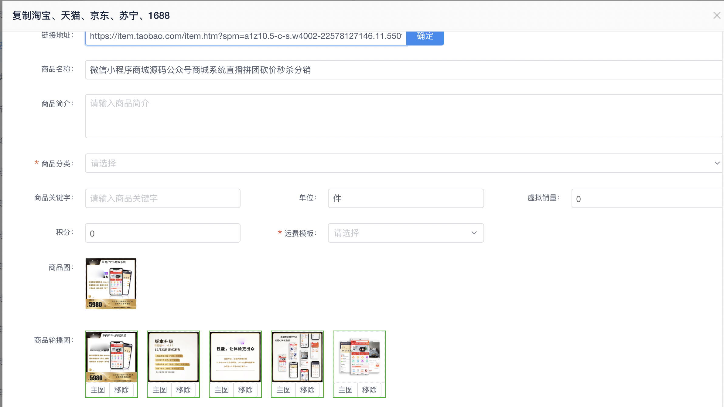 2.目前商品采集支持一键采集:淘宝、天猫、京东、苏宁、1688。