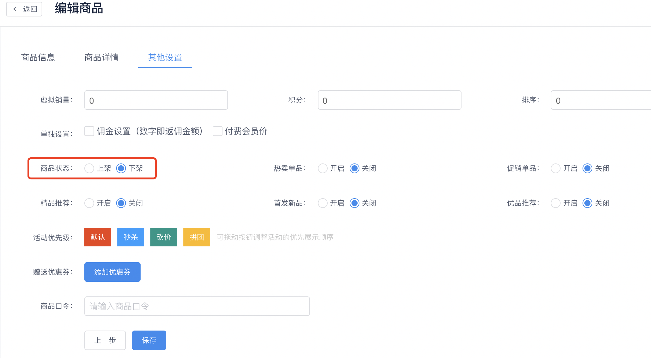 点击编辑可以商品进行修改完善,状态点击上架,前台即可展示。