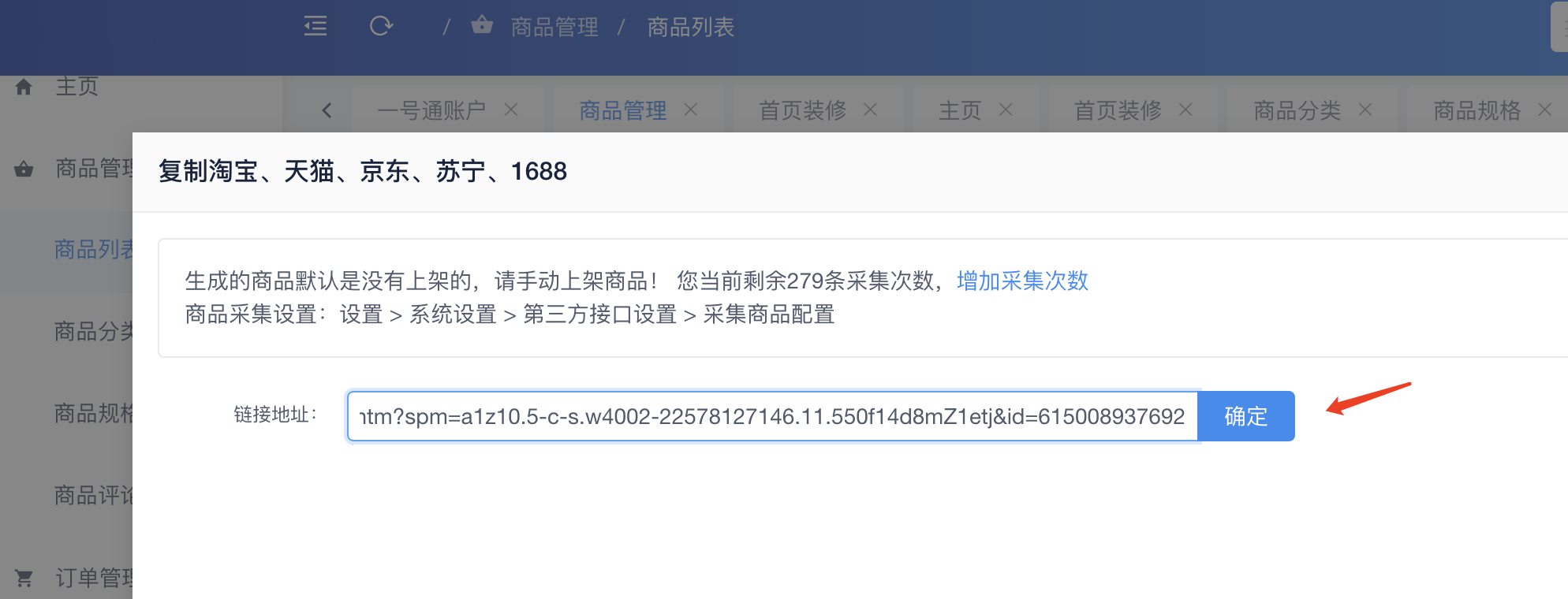 打开系统后台,商品管理 - 商品列表 -商品采集