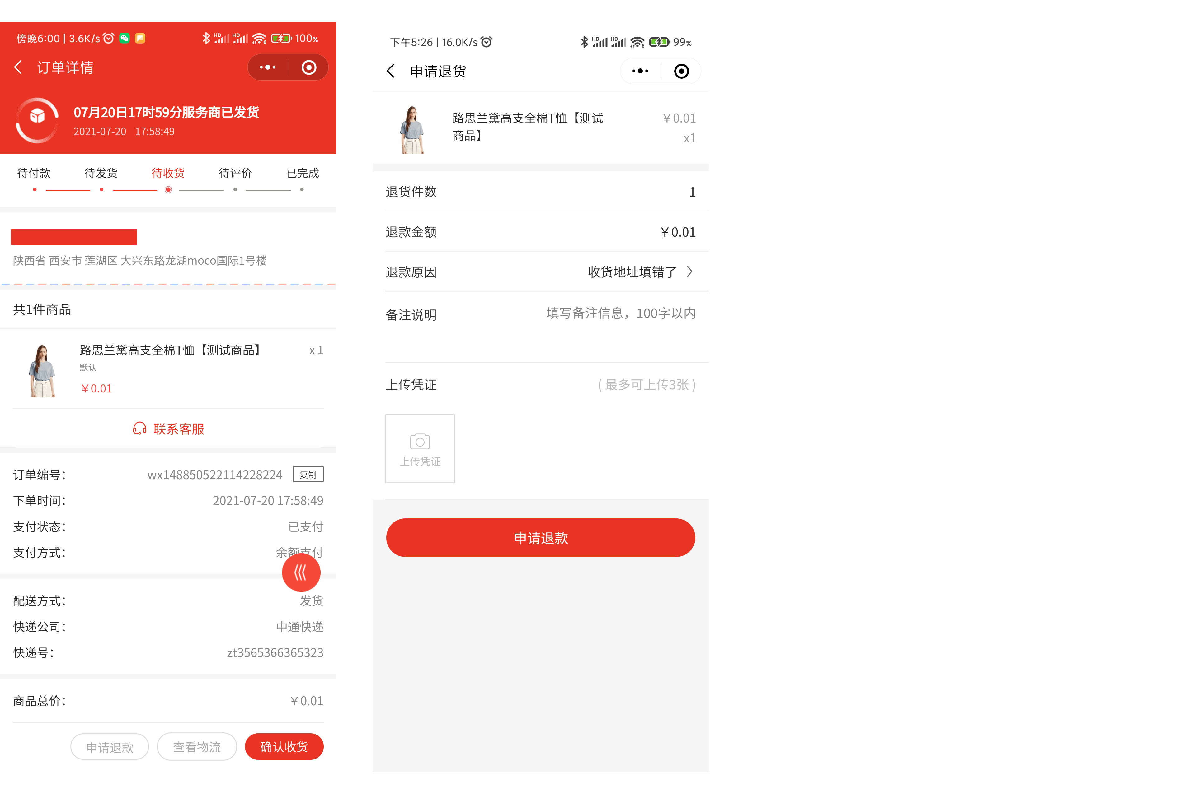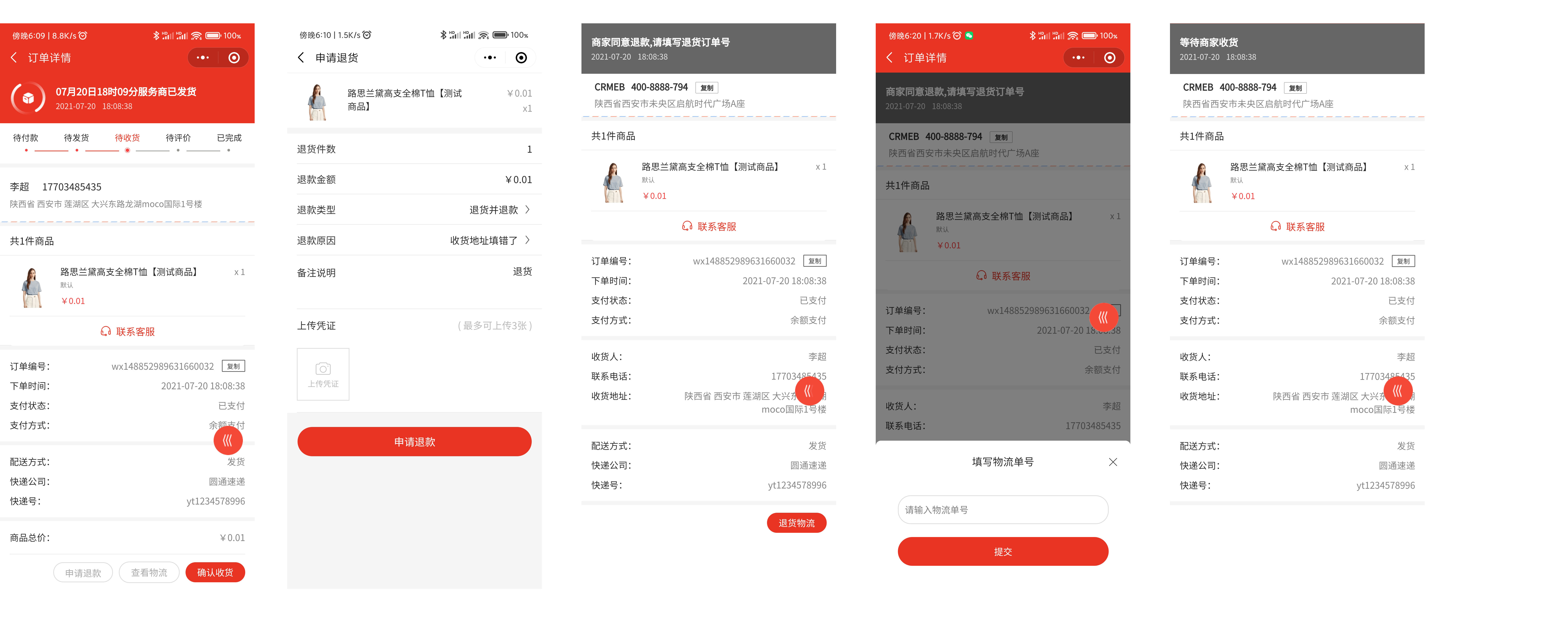 用户退款申请商家同意后,需将商品通过快递寄给商家,商家确认后金额原路退回