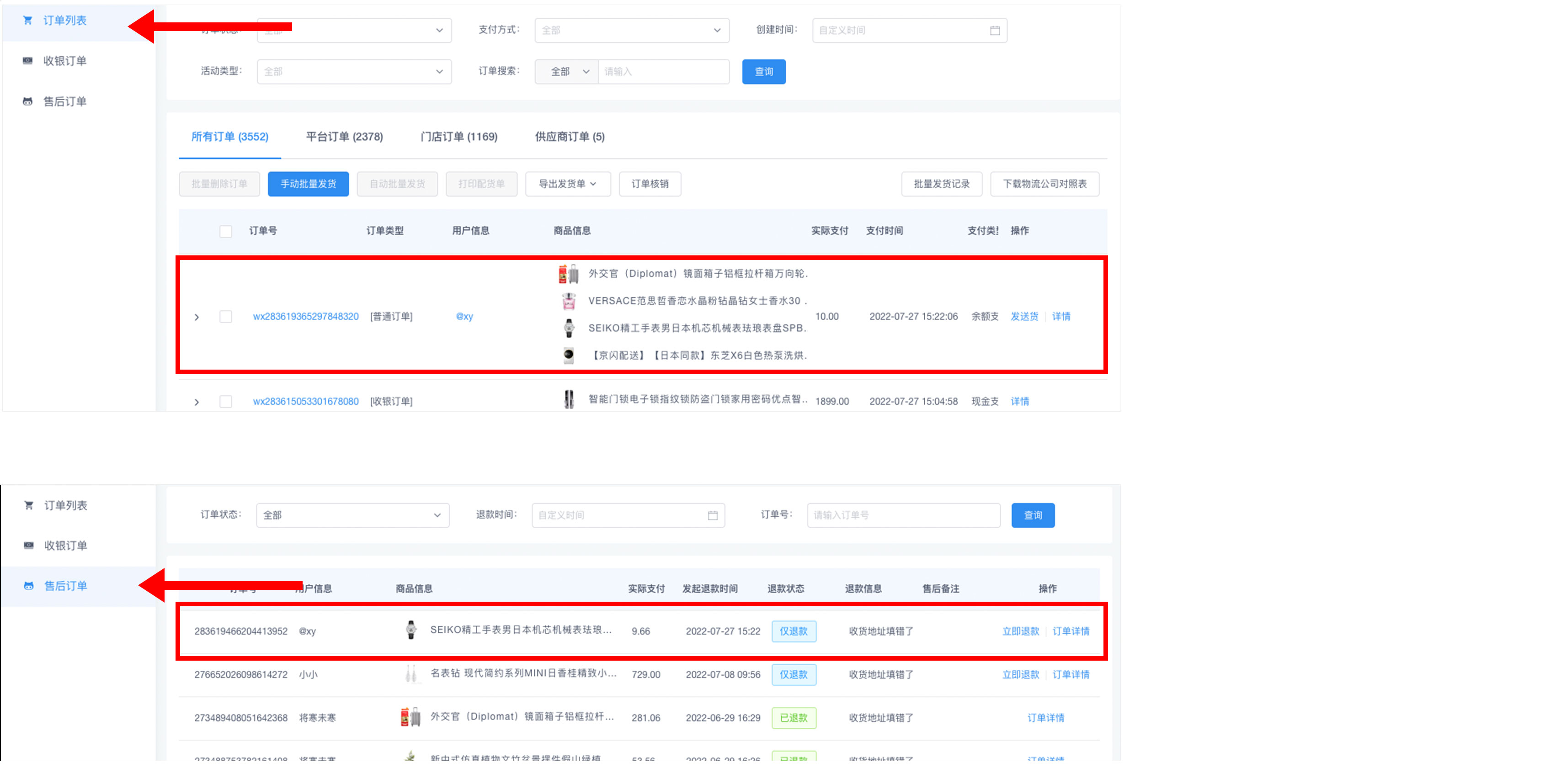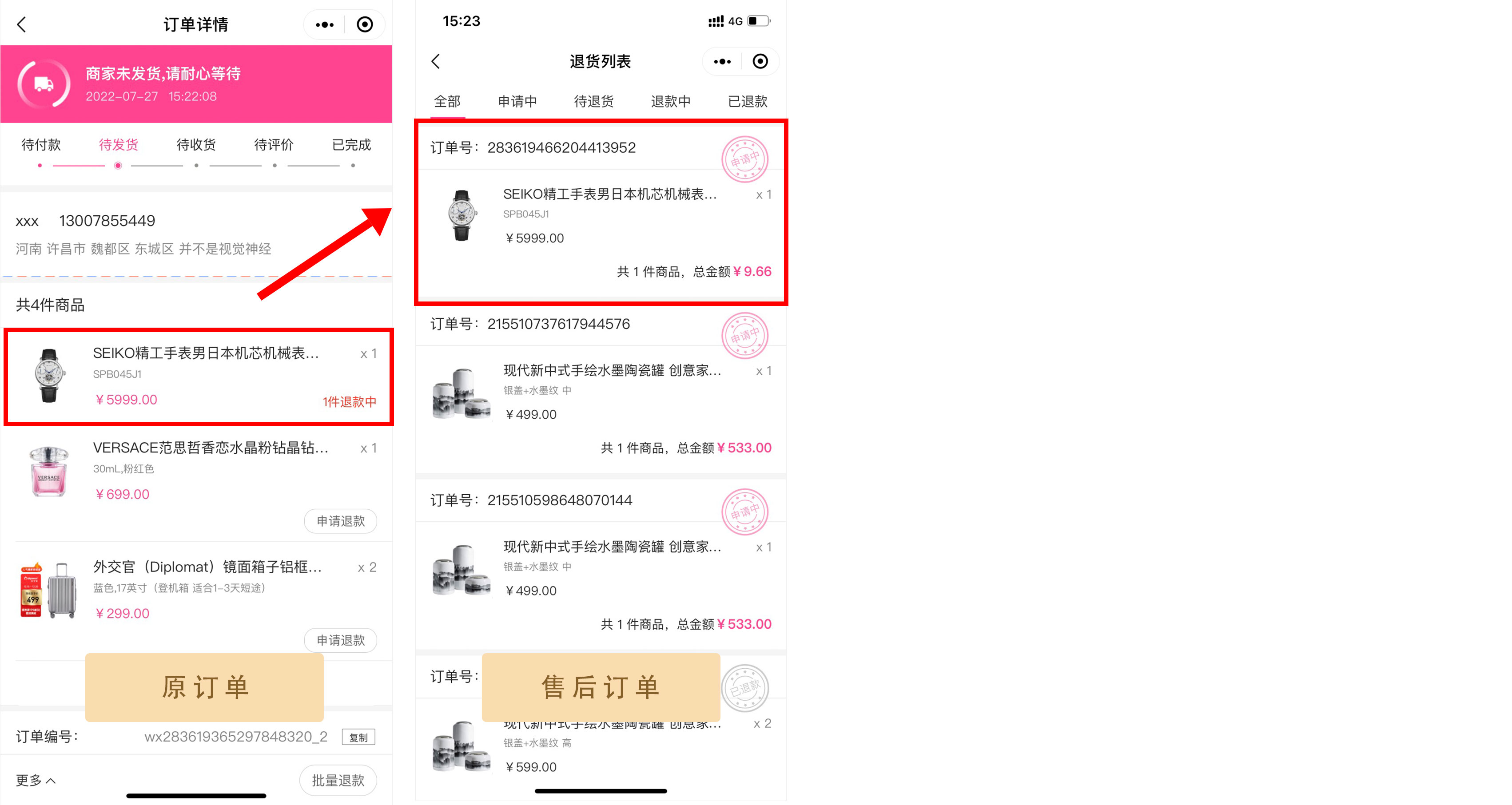 当订单存在多件商品只退款其中n件的情况下,退款的订单进入售后订单中,原订单显示退款商品
