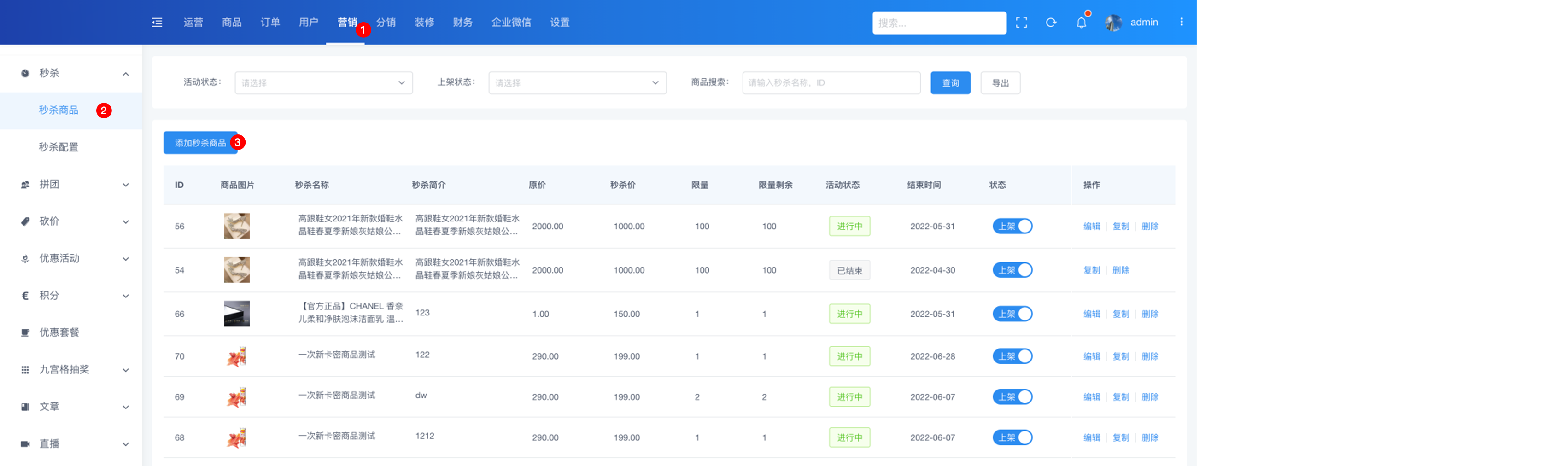 营销 > 秒杀 > 秒杀商品/秒杀配置