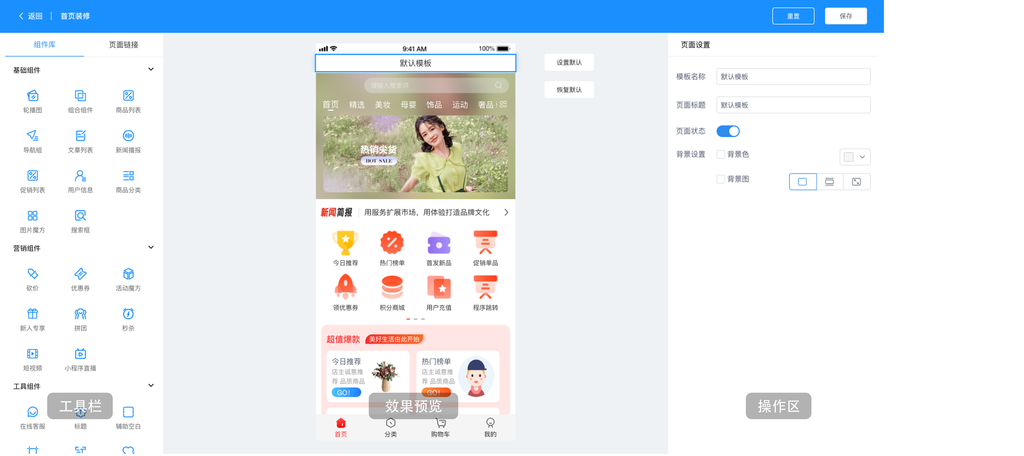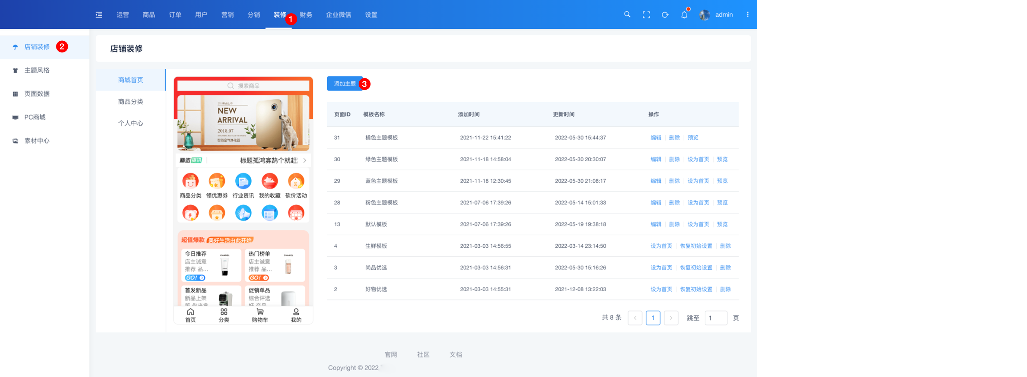 主页装修分为商城首页、商品分类和个人中心