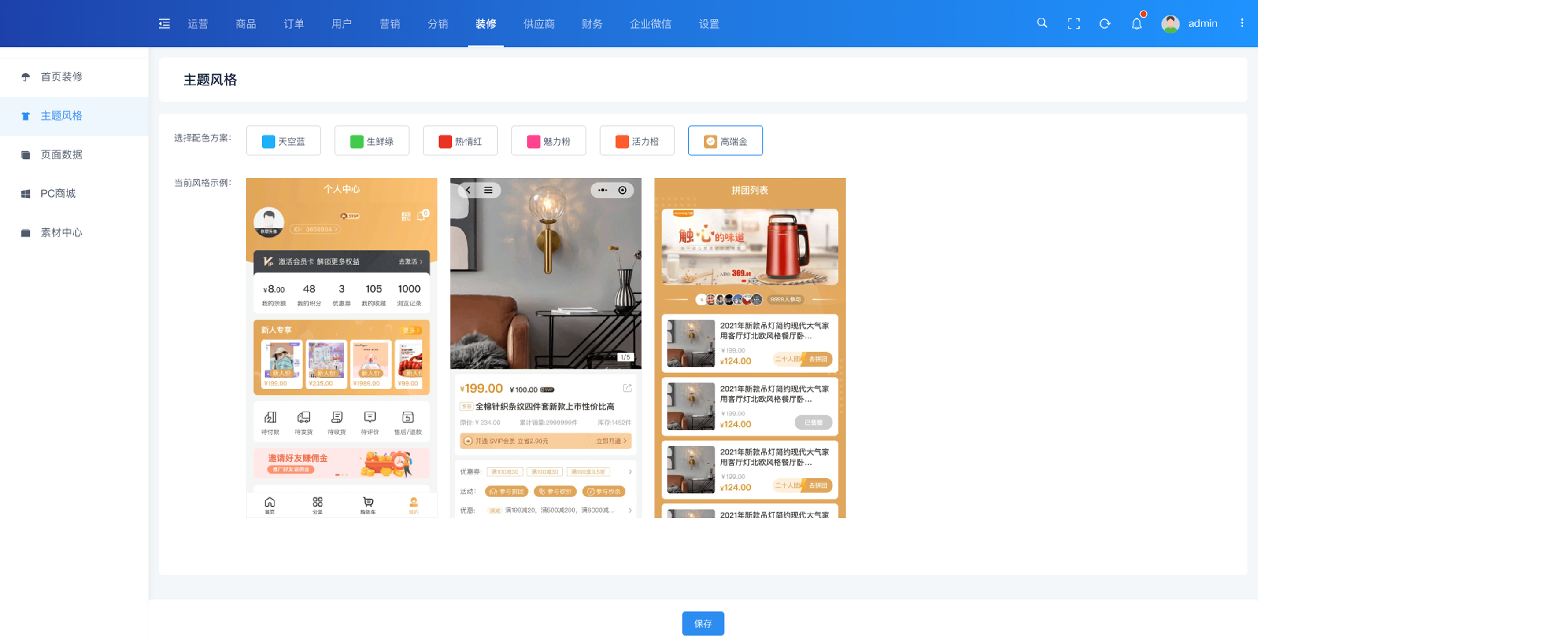 可选择多种风格样式切换,切换之后除了首页,商城整体的风格样式即做修改