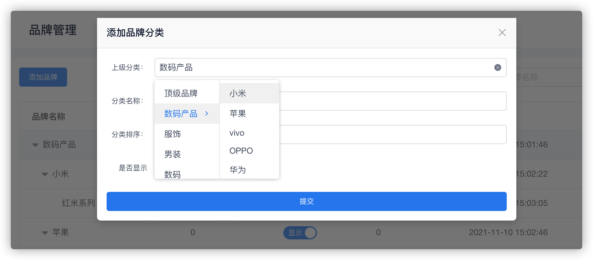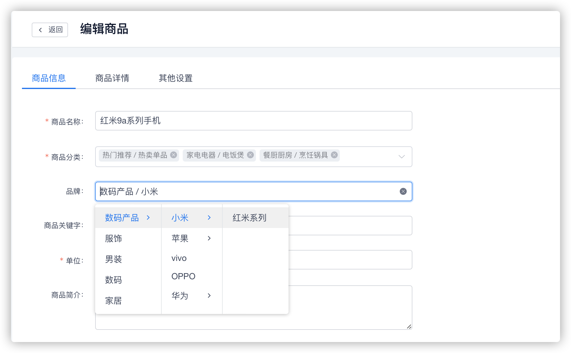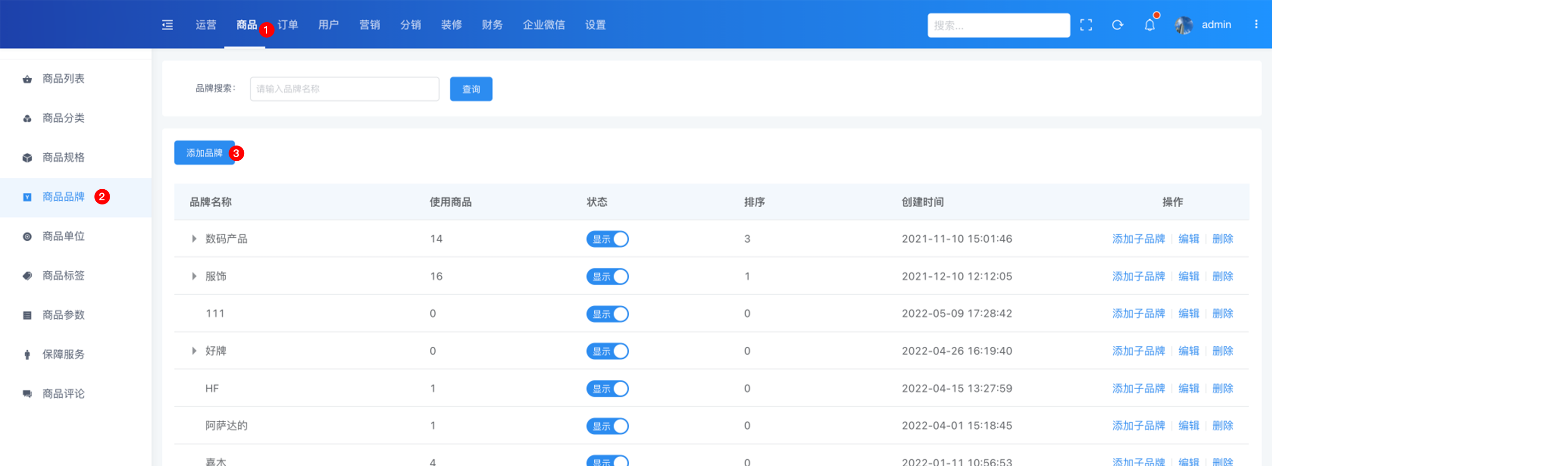 品牌功能最多支持三级品牌模式,也可单独使用一、二级;在使用过程中可根据自己需求选择品牌,进行商品关联。