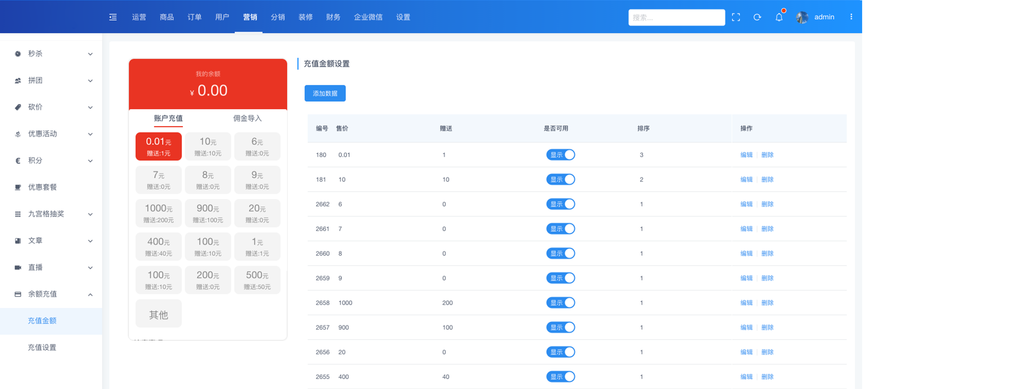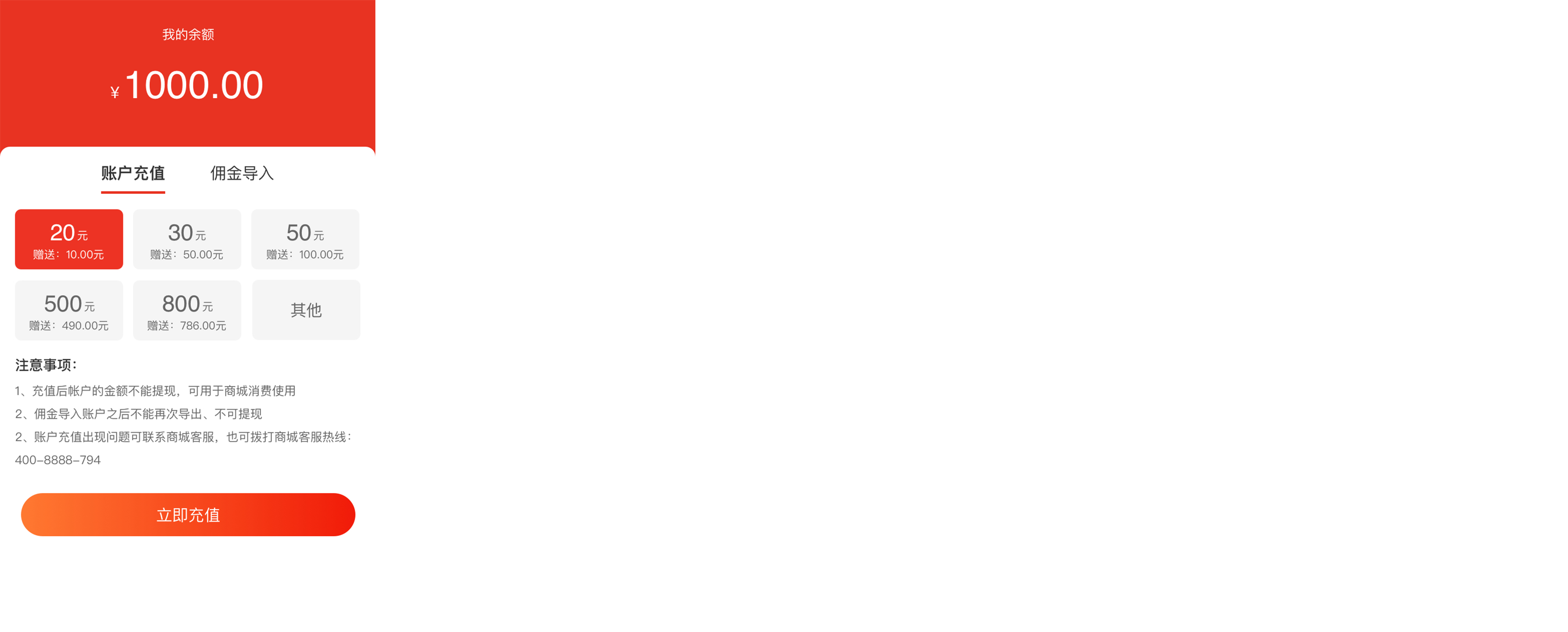 商城余额充值助力提高客户粘性与活跃度。设置分为充值金额设置、充值基础设置。