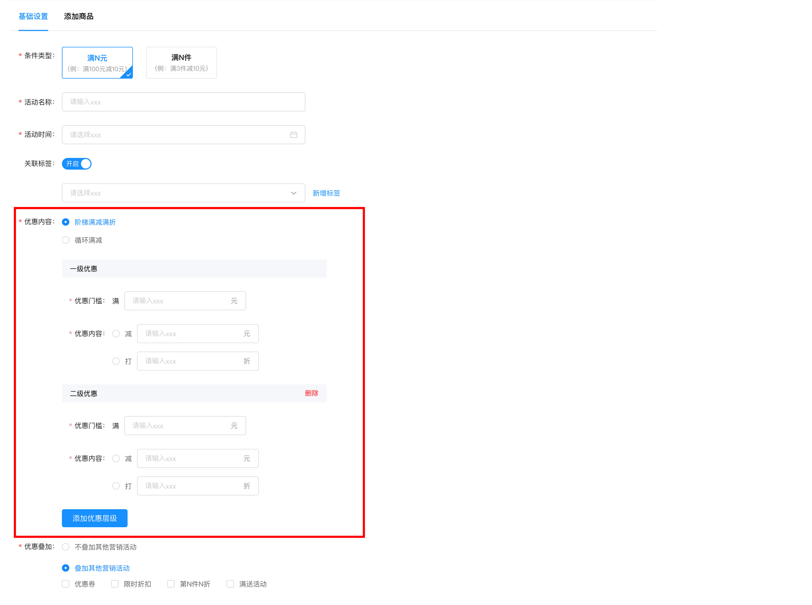 1.选择阶梯满减满折或循环满减