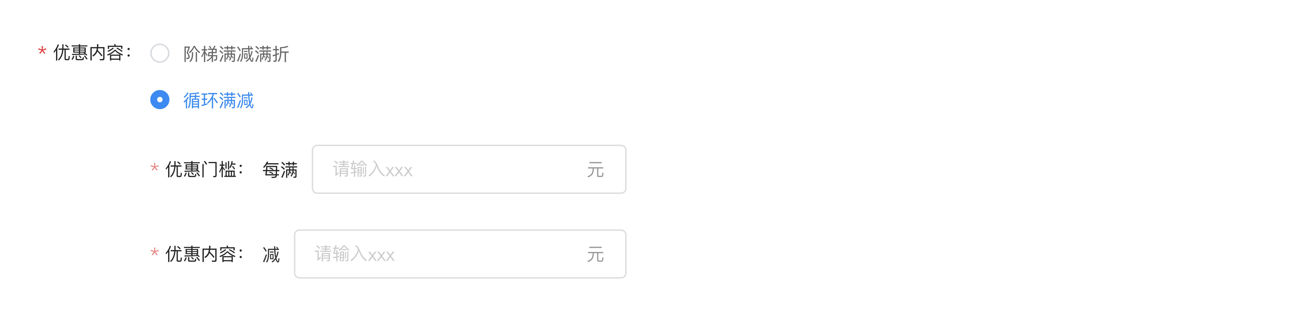 2.优惠门槛输入满()件/元—优惠内容选择打()折或减()元,例:满100元减10元