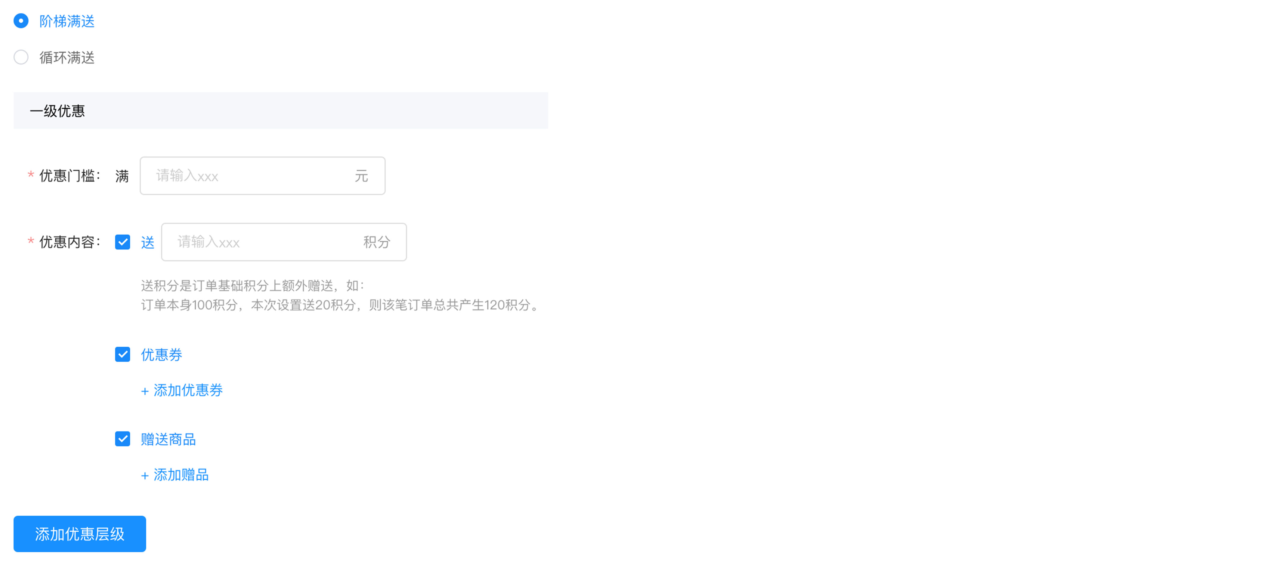例:当后台设置一级优惠满100元送10元优惠券、手机壳,二级优惠满500元送20元优惠券、充电宝时,用户购买满500元则送20元优惠券和充电宝(不享受一级优惠)。