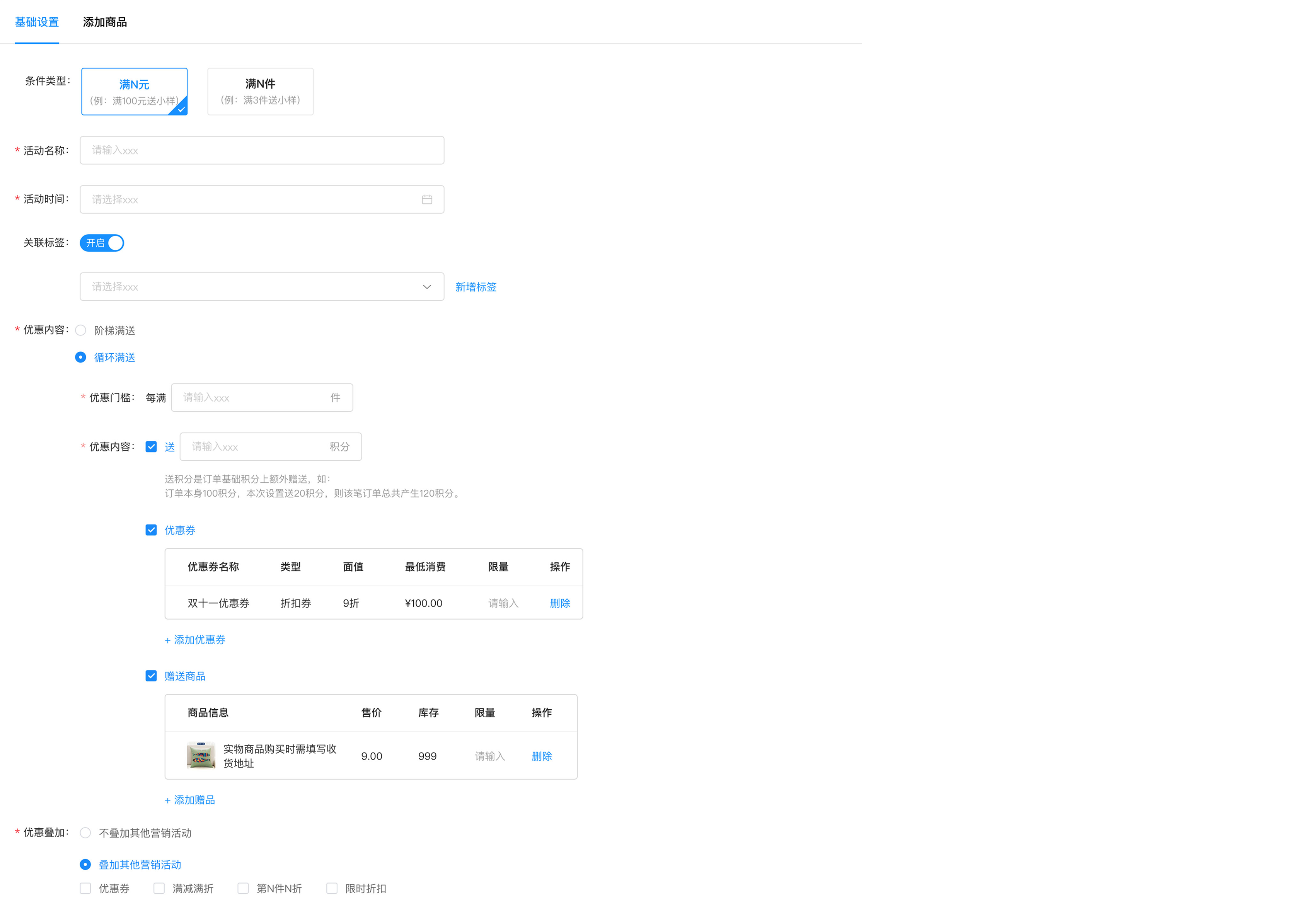 ⚠️循环满送时优惠券只送一次,赠品和积分可多次赠送