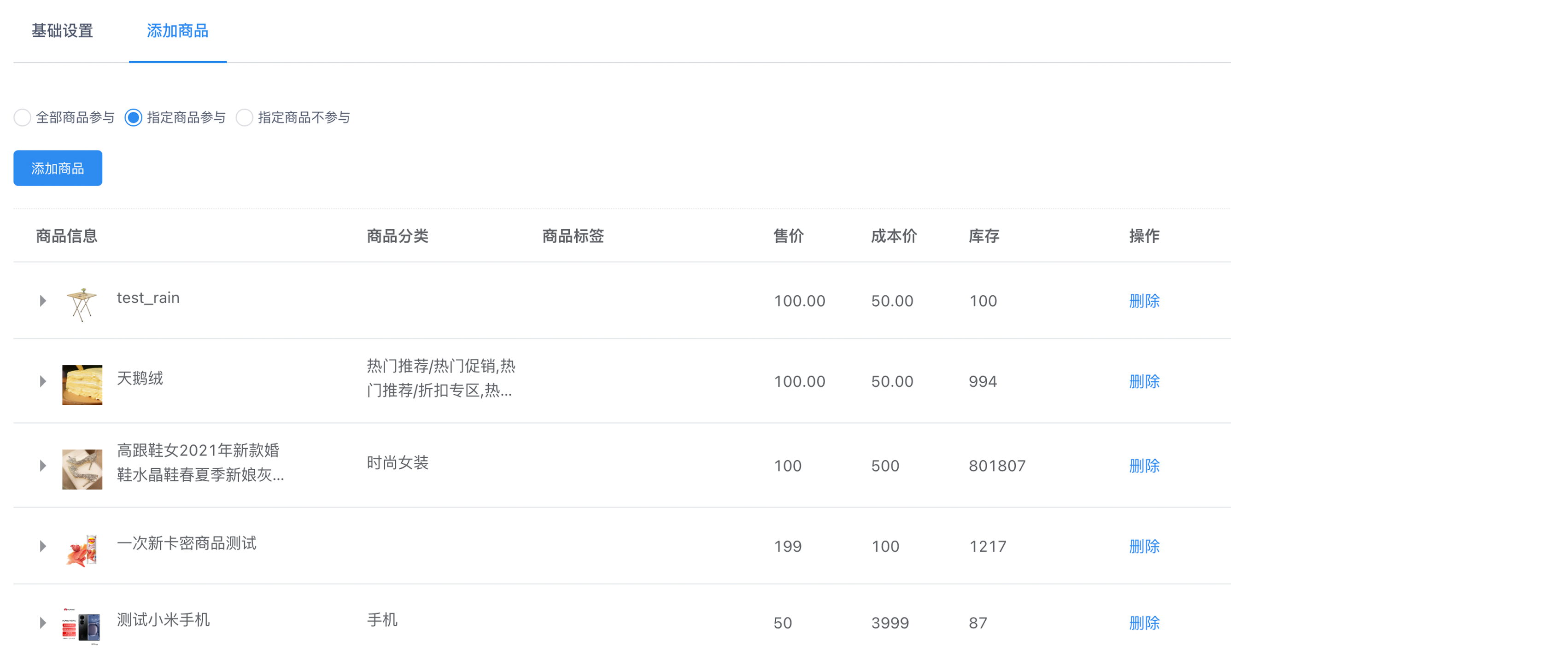 1.可以选择全场商品参与、指定商品参与、指定商品不参与