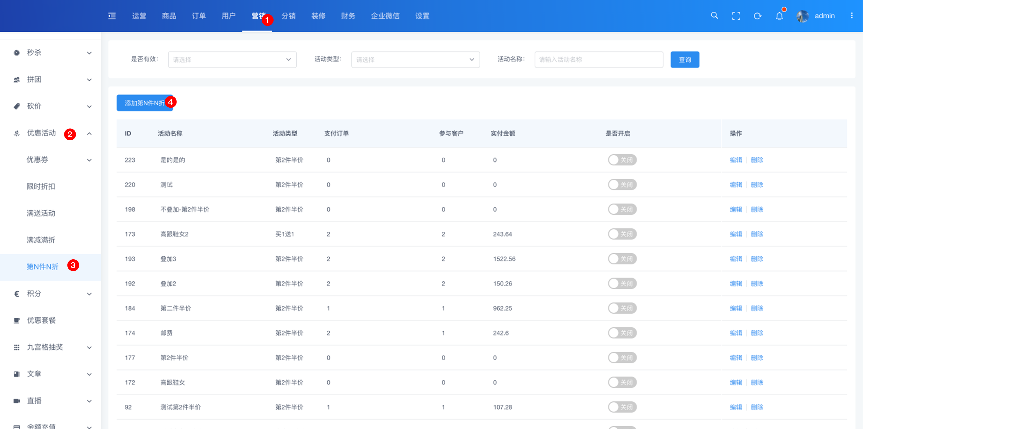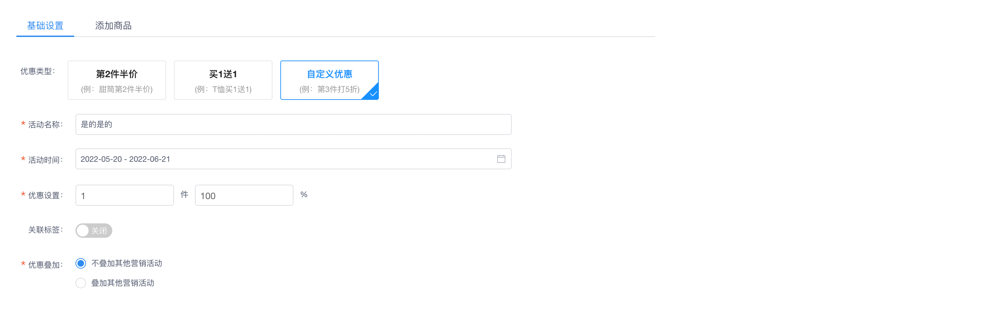 活动类型:选择本次活动的类型,含第2件半价、买1送1、自定义优惠