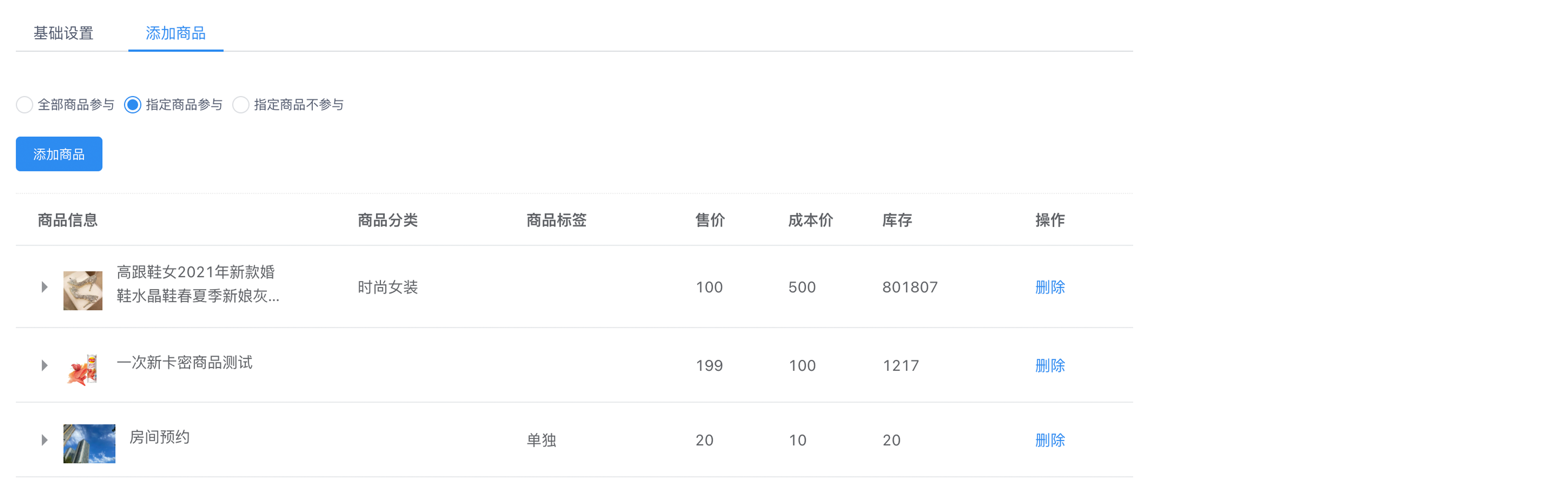 1.可以选择全场商品参与、指定商品参与、指定商品不参与