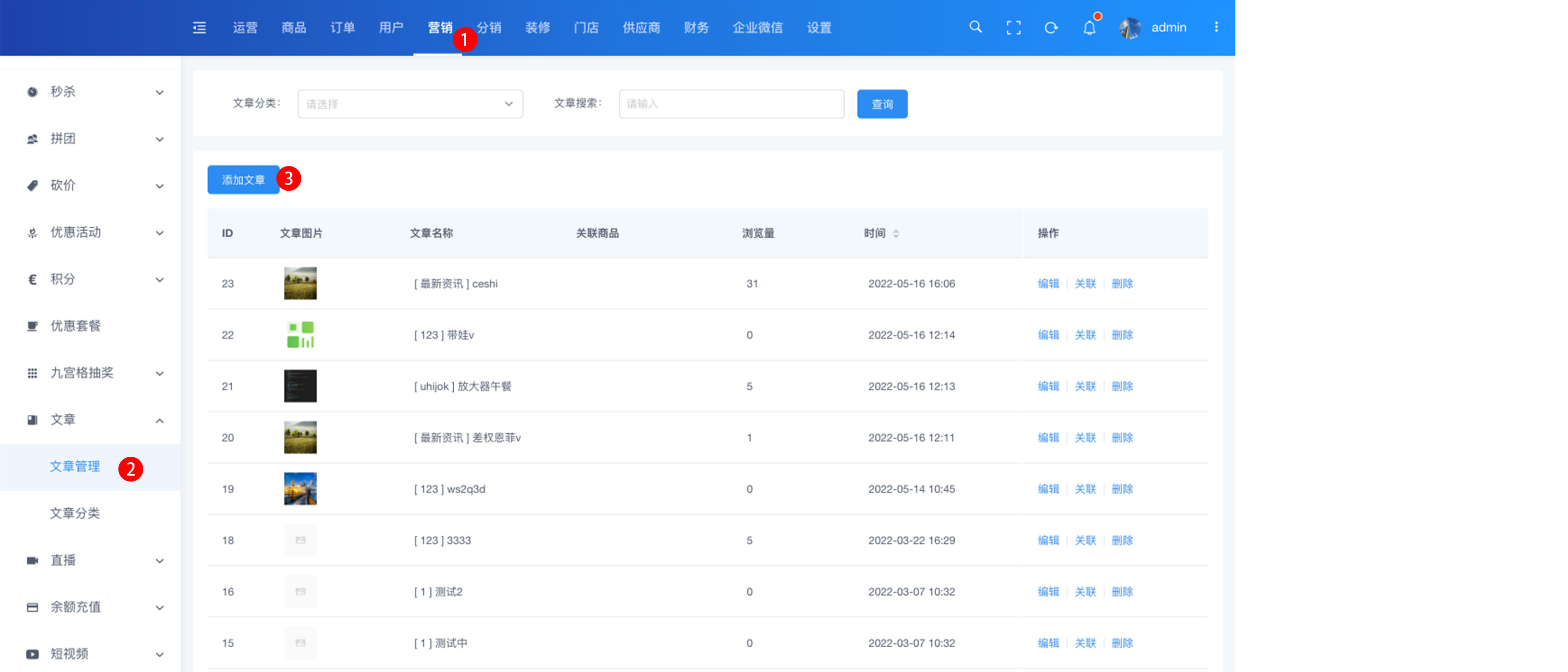 可以进行新闻资讯的添加以及删除等操作,文章亦可关联相关产品进行推广。